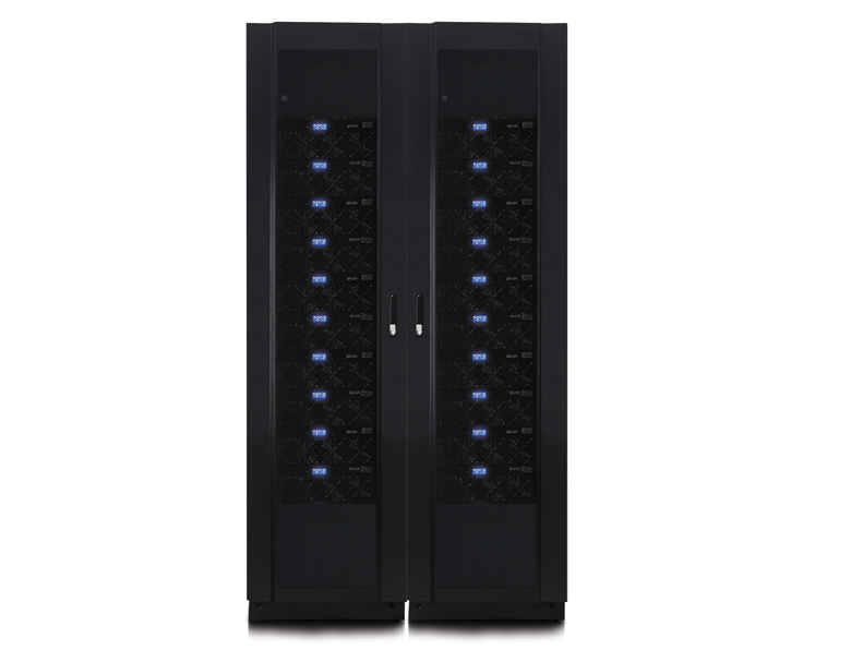 UPS trifísico modular y escalable de alto rendimiento de Chicago Digital Power para centros de datos. Un solo módulo de energía intercambiable en caliente en 20kVA a 208 y 40kVA 400V se aloja en este gabinete de 20 módulos que incluye ranuras para el reemplazo rápido de los módulos de energía en caso de un evento o para mantenimiento.